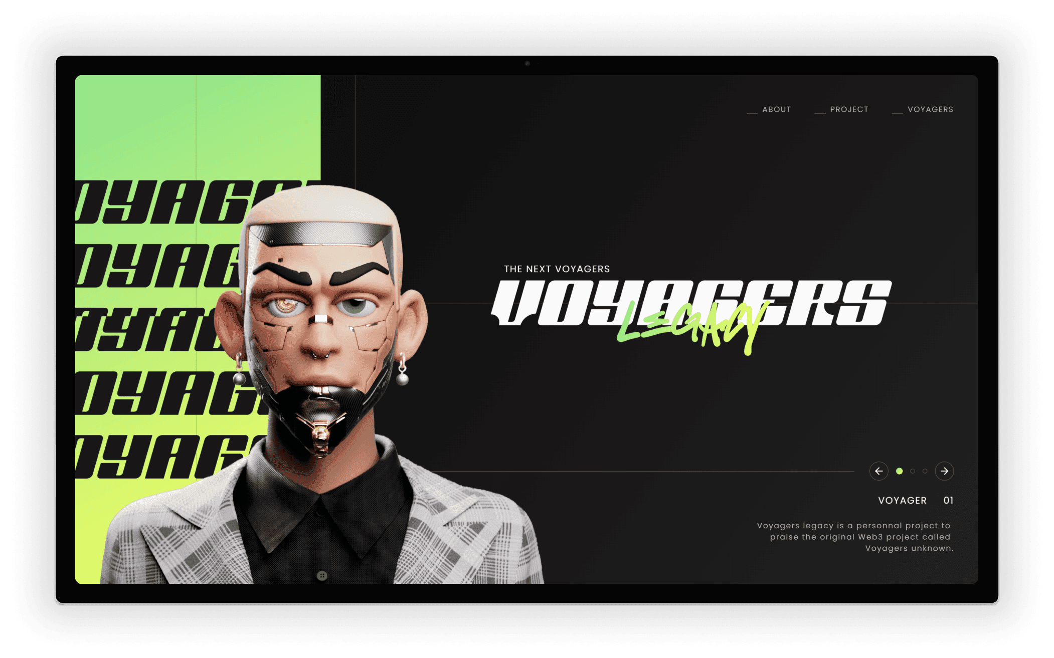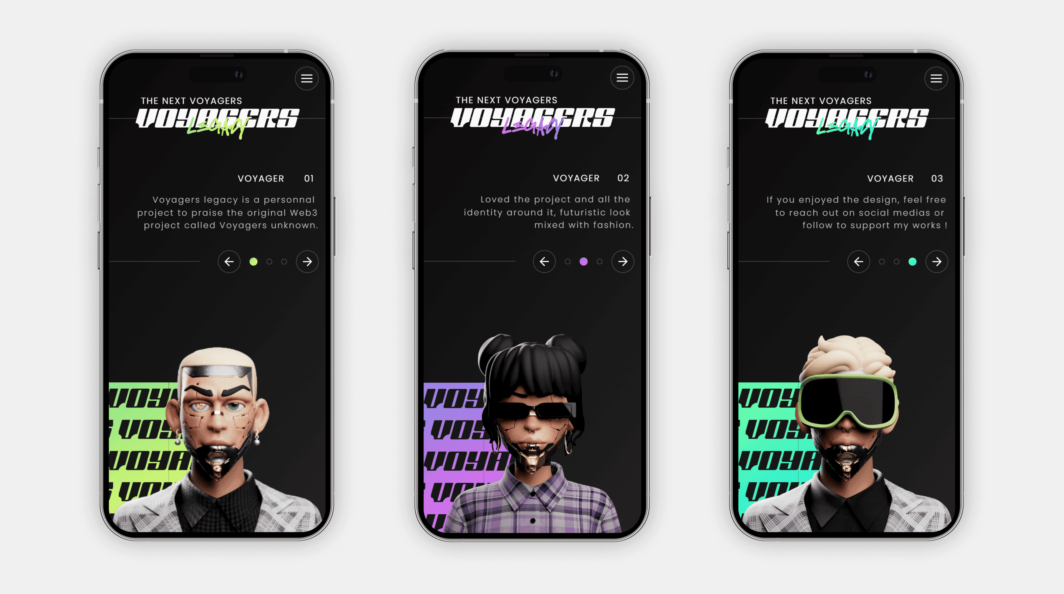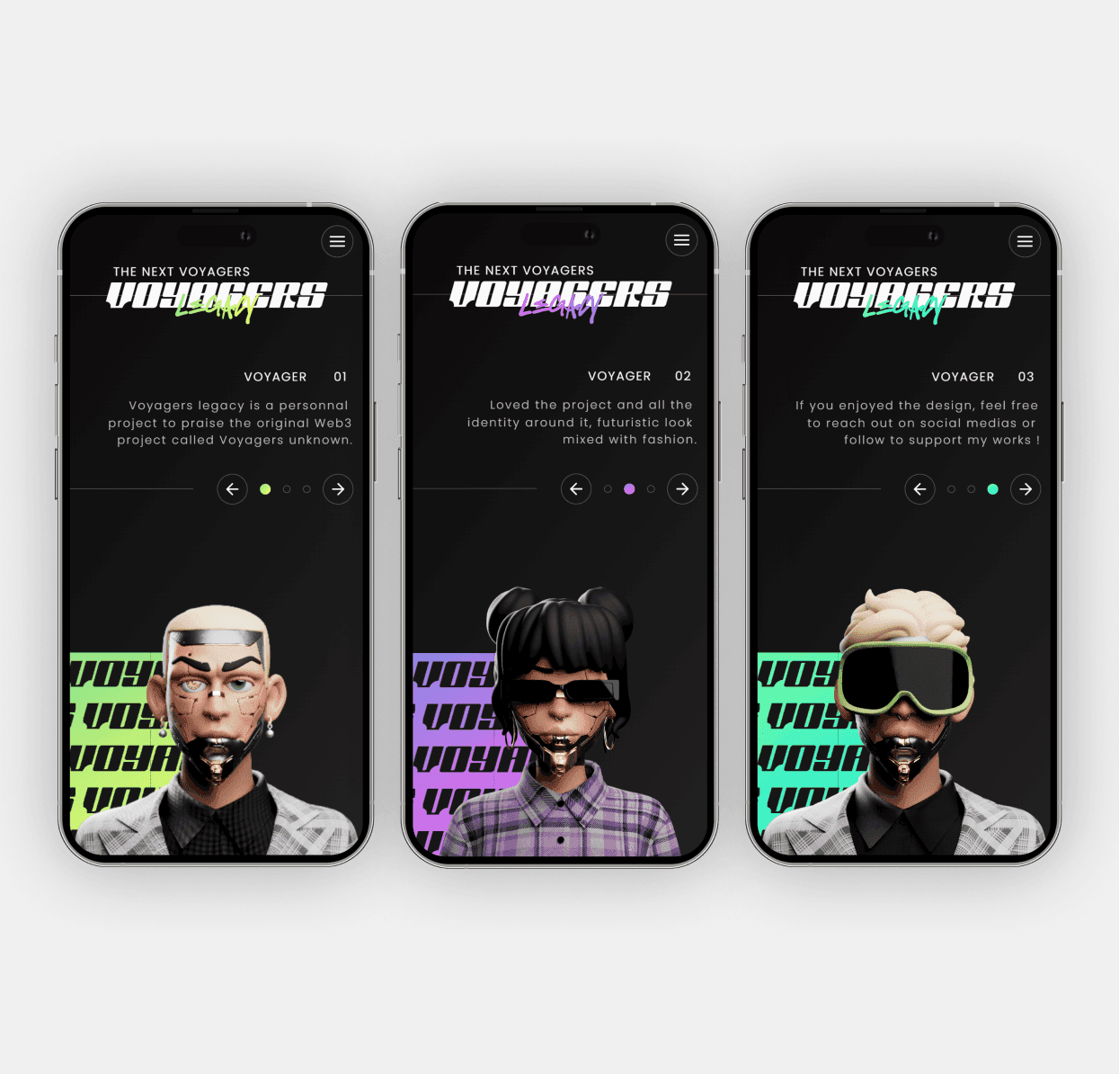 Voyagers Legacy est un projet personnel qui rend hommage au projet Web3 original "Voyagers Unknown". Il a été conçu comme une section Hero à part entière en plein écran. Le but étant de montrer un visuel reflétant l'univers du projet avec une interface interactive, fluide et esthétique.