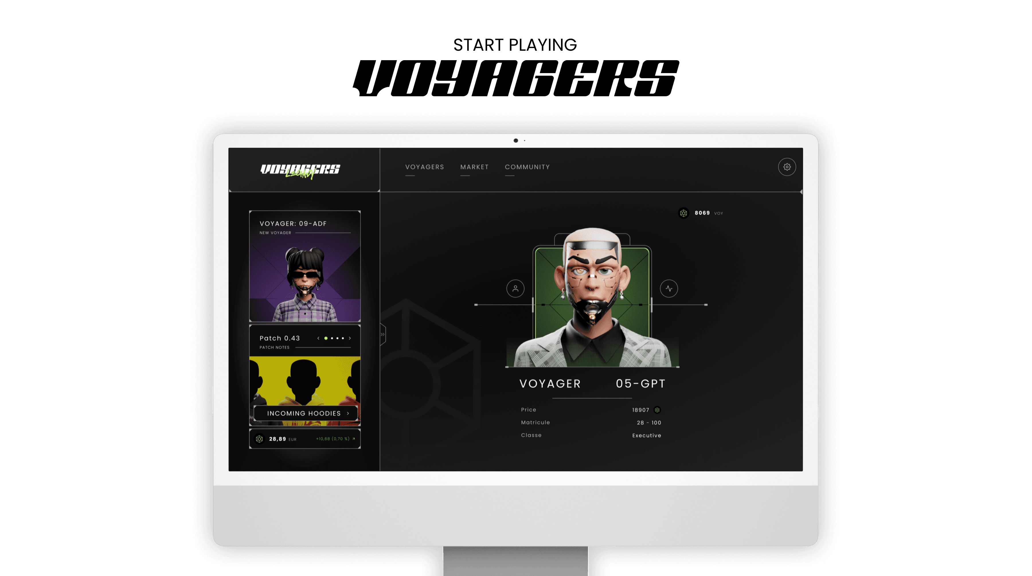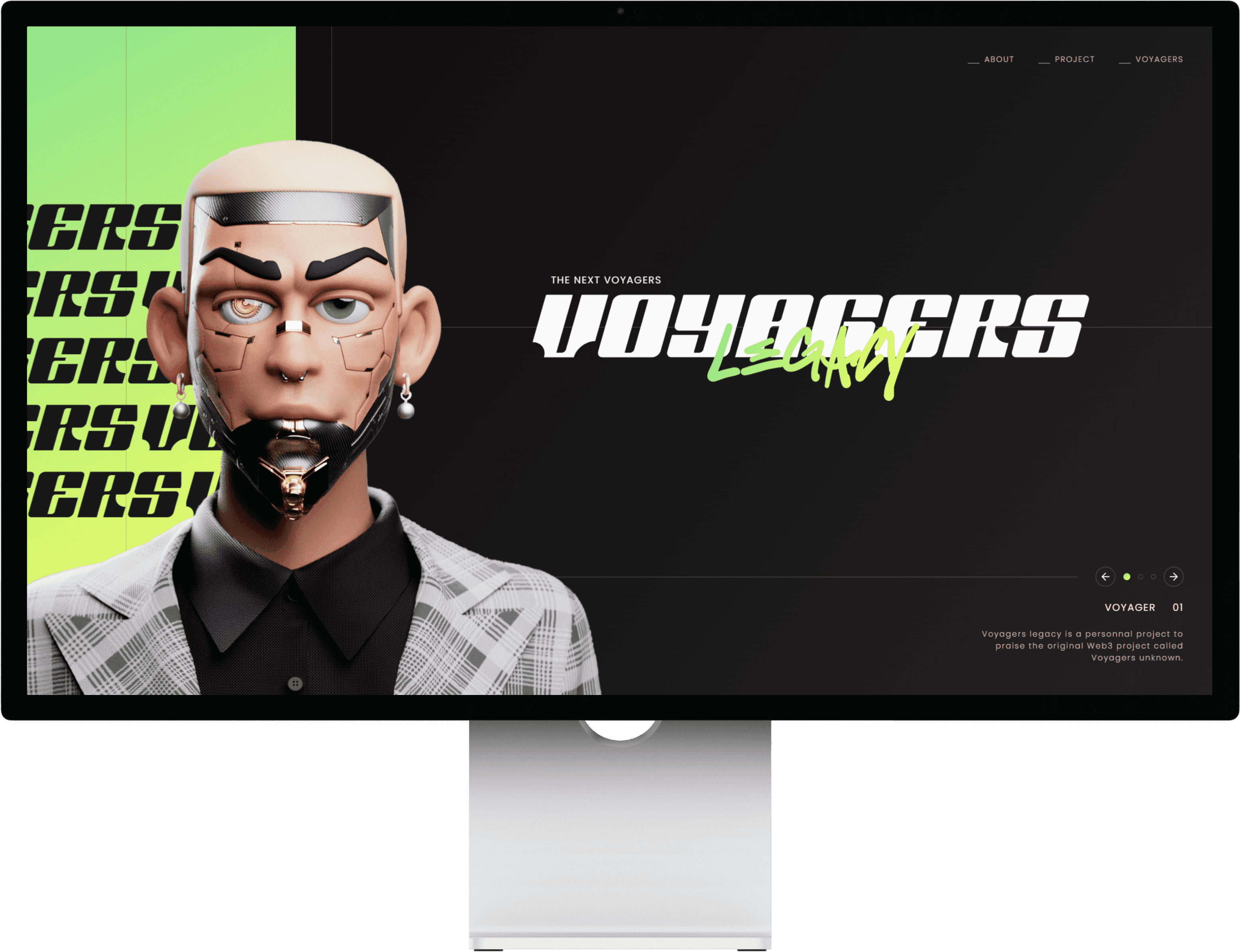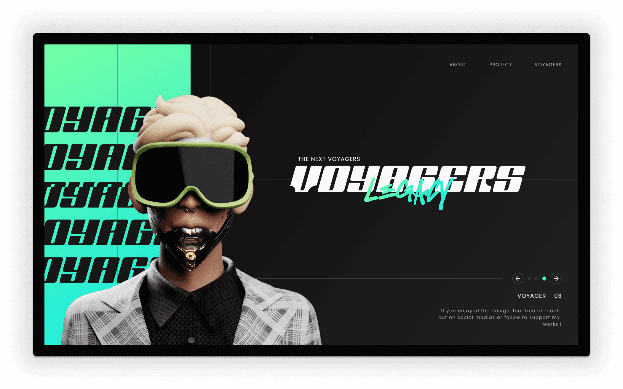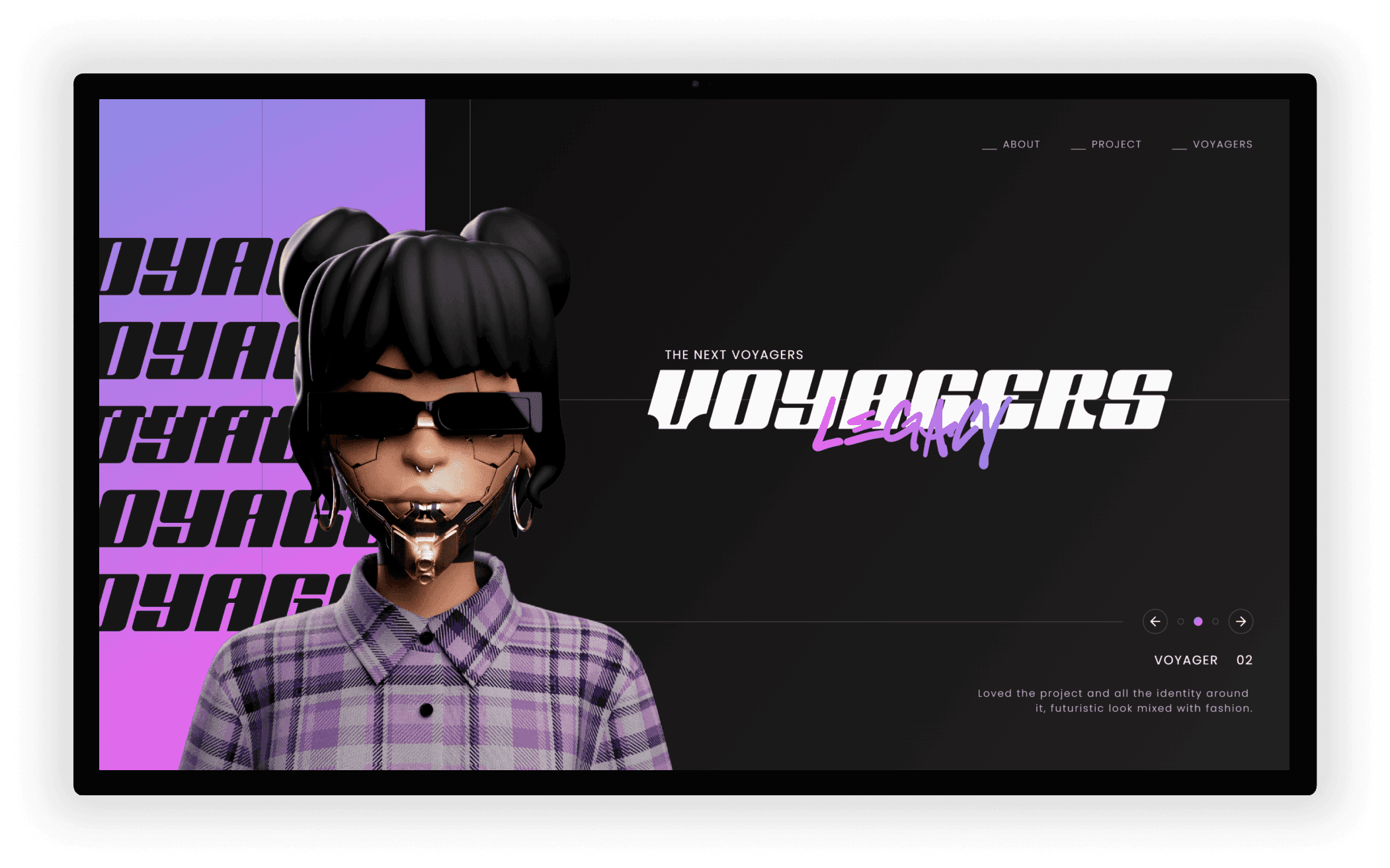 Voyagers Legacy est un projet personnel qui rend hommage au projet Web3 original "Voyagers Unknown". Il a été conçu comme une section Hero à part entière en plein écran. Le but étant de montrer un visuel reflétant l'univers du projet avec une interface interactive, fluide et esthétique.